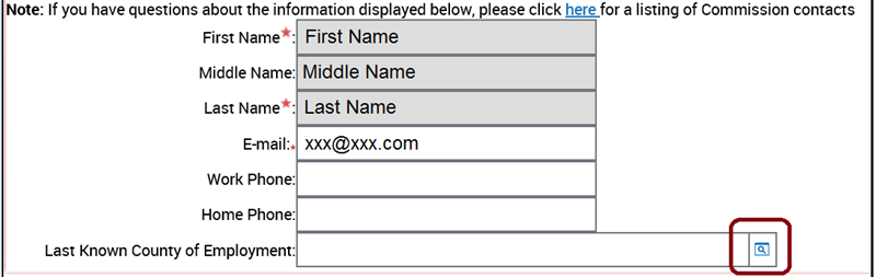 Last Known County of Employment: Click the search icon on the right side of the field. Then select your County of Employment from the pop-up window.