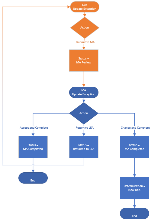 Determinations travel through a hierarchy. At the first level, local education agencies will review and determine exceptions. They will provide the bulk of the determinations, though nothing in the system precludes Monitoring Authorities from also participating in this process.