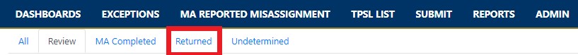 - Returned to MA: Like the MA Review status, these exceptions are displayed in the “Review” Exceptions tab for MA CalSAAS users, and can be viewed by LEA CalSAAS users in the “All” Exceptions tab.