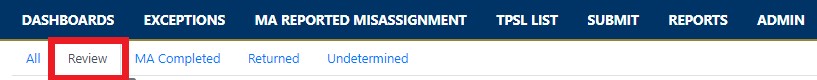 - MA Review: Exceptions that need to be reviewed by the MA. These may be either predetermined exceptions or exceptions submitted to the MA by the LEA. LEA CalSAAS users can view exceptions with this status in the “All” Exceptions tab but the LEA user cannot edit exceptions that have a status of “MA Review”. Monitoring Authority CalSAAS users can access these exceptions in the “Review” Exceptions tab: