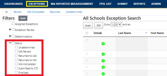 The Status options are also available when viewing exceptions in the Exception screens. To filter, a user can select one or more of the status options on the left-hand side and then click “Apply”.