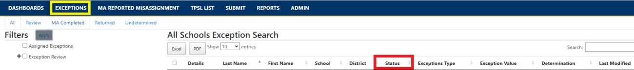 - MA Completed: Exceptions that have been reviewed and completed by the MA, either by the MA accepting a determination from the LEA or changing the determination. Exceptions with the MA Completed status can still be edited by the MA. For example, the MA can change the determination or send the exception back to the LEA for further review.